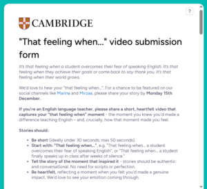 Para ello, Cambridge English os ofrece la posibilidad de aparecer en sus RRSS con un vídeo en el que contaréis vuestros momentos favoritos en la enseñanza de idiomas. Si estáis interesados sólo tenéis que seguir los pasos que encontraréis en este enlace.